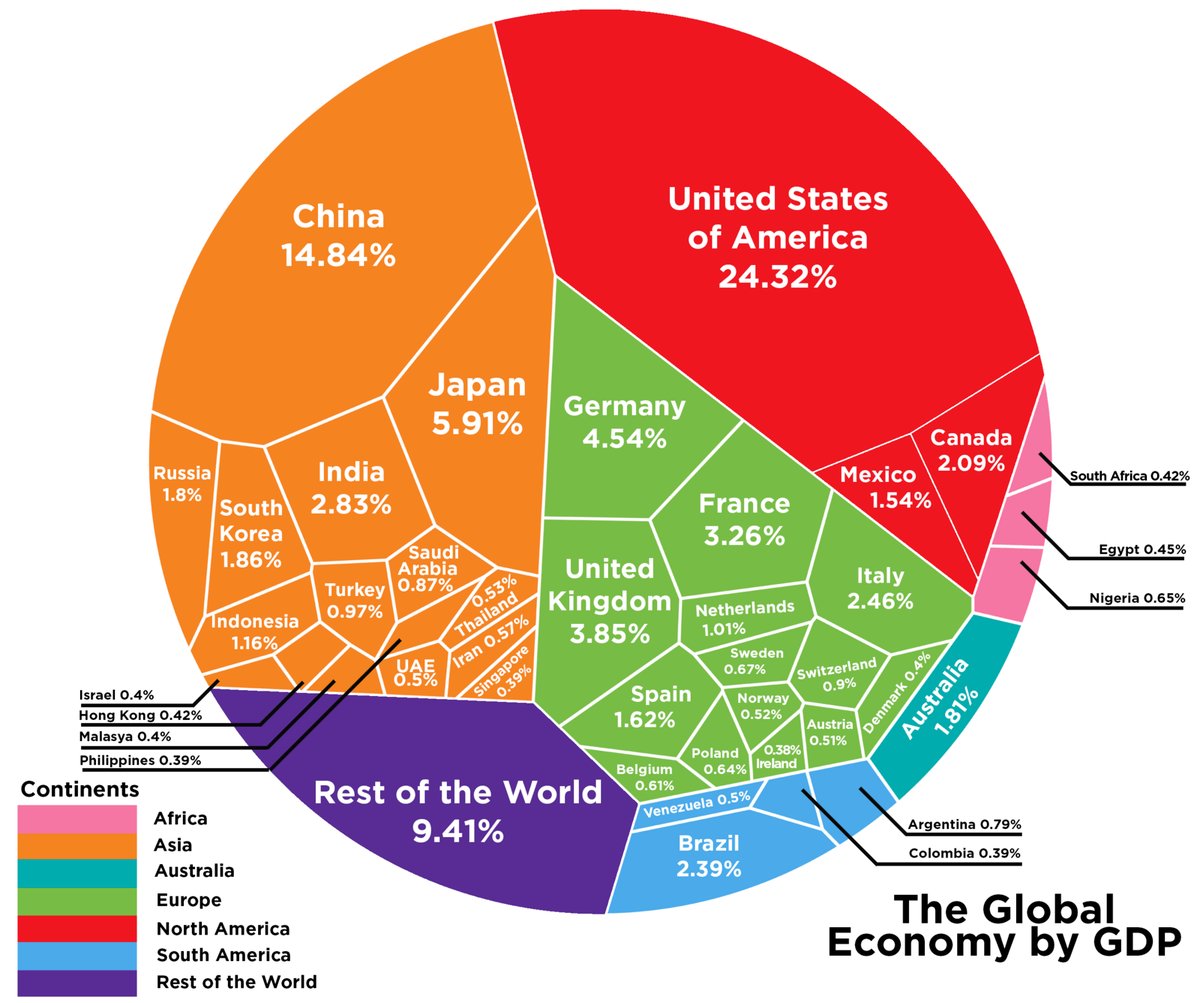 Какую долю капитала выделять на акции России и Казахстана? А сколько денег вкладывать в акции Китая, Европы, США? Как определить для себя эту долю и почему именно ЭТУ долю? К видео про акции Казахстана было оставлено несколько комментариев, которые дали пищу для этого ролика. Почему я так жестко себя ограничиваю - только акциями США? Почему бы не покупать те же акции РФ или Казахстана хотя бы в той пропорции, которую они составляют в мировой экономике и мировом фондовом рынке? Потому что доля эта настолько мала, что и говорить о ней смешно. Как всегда - очень важно проверить факты, а уже затем принимать решение. Итак, если мы смотрим на статистику по Валовому Внутреннему Продукту (важнейшему параметру, измеряющему экономику), то внезапно выясняется, что на Россию приходится лишь 1.8% мирового ВВП! 1.8% - вдумайтесь в это значение, друзья. Для сравнения, на США приходится 24%. И почти 15% на Китай. Кстати, Казахстана здесь нет - его доля в ВВП слишком мала, чтобы быть включенной в