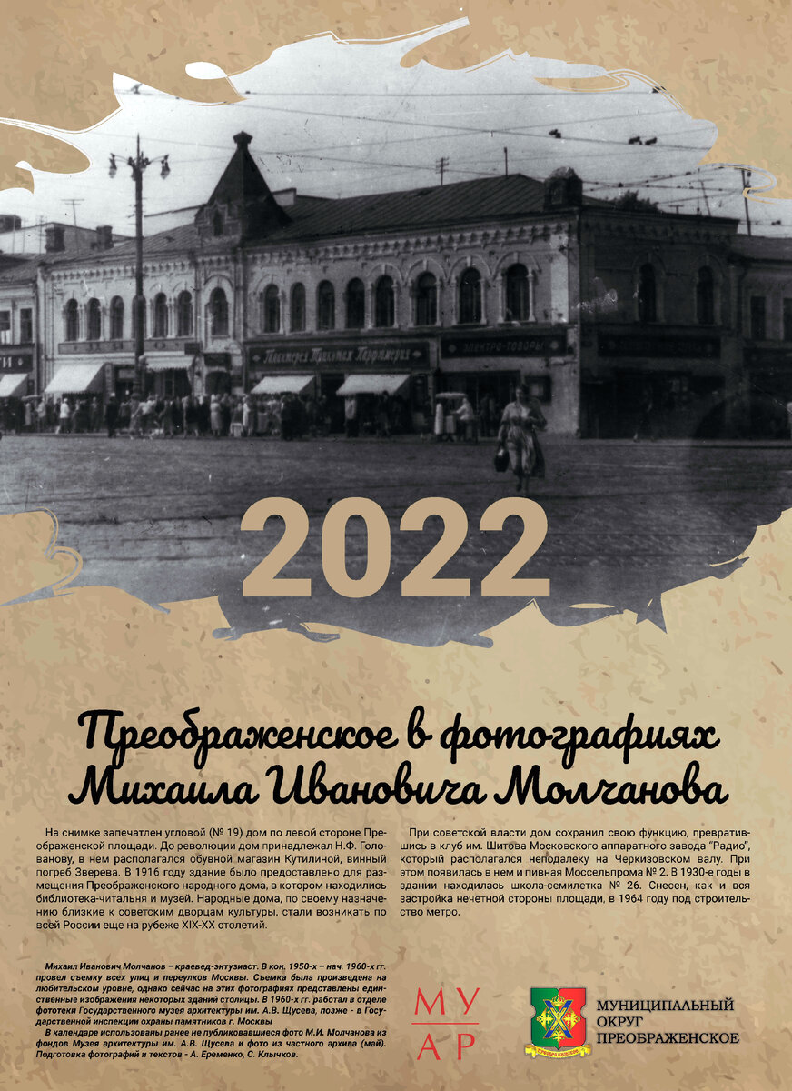 Идея сделать такой некоммерческий календарь возникла совместно с муниципалитетом района Преображенское. Благодаря поддержке главы муниципального округа Надежде Игоревне Иноземцевой и депутата Светланы Николаевны Кобзарь ее удалось осуществить. В календаре представлены 12 фотографий из фондов Государственного музея архитектуры имени А.В. Щусева Михаила Ивановича Молчанова конца 1950-х - начала 1960-х годов и одна фотография 1934 года из личного архива. Михаил Иванович Молчанов – краевед-энтузиаст. В кон. 1950-х – нач. 1960-х гг. провел съемку всех улиц и переулков Москвы. Съемка была произведена на любительском уровне, однако сейчас на этих фотографиях представлены единственные изображения некоторых зданий столицы. В 1960-х гг. работал в отделе фототеки Государственного музея архитектуры им. А.В. Щусева, позже - в Государственной инспекции охраны памятников г. Москвы. С фотографиями Молчанова вы уже успели познакомиться в этом году на канале "Память места". Наверняка многим из вас они п