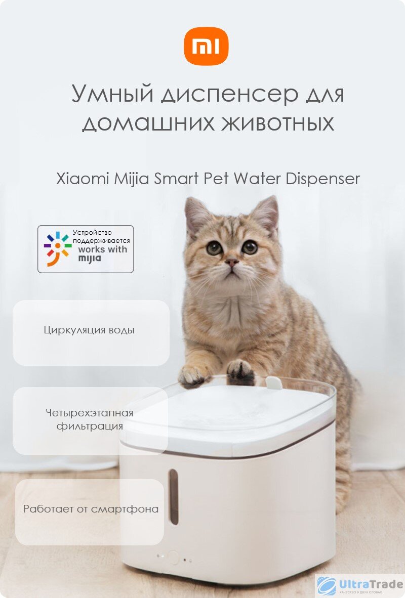 Описание Новый умный диспенсер для животных – стильное и практичное решение для вашего дома. Благодаря резервуару на 2 литра, воды питомцу хватит надолго, а четырехэтапная фильтрация поможет избежать камней в почках. Циркуляция воды обогатит ее кислородом, что улучшит ее вкус и качество. Угол наклона в 7 градусов – это оптимально удобное положение мисочки для животного. Этапы фильтрации Чистая вода – залог здоровья для ваших питомцев. Четырехуровневая фильтрация отлично очищает воду. Система очистки улавливает волосы, остаточный хлор, ионы кальция и магния. Микропористая сетка из полипропилена очищает воду от волос или мусора. Для более мелких частиц есть хлопок, он фильтрует песок и грязь. Слой из активированного угля абсорбирует остаточный хлор, а ионообменная смола притягивает на себя ионы кальция и магния, которые могут образовать камни у вашего питомца. Тишина Умный диспенсер для домашних животных Xiaomi Mijia заботится о вашем сне, поэтому его работа происходит абсолютно бесшумно