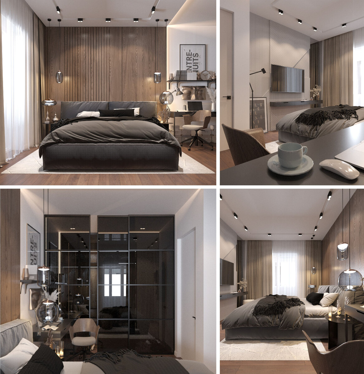 На примере этой спальни, еще одной функциональной зоной будет являться отдельная гардеробная и вместо привычных нам перегородок из пазогребневых плит, газоблока или кирпича, я применяю раздвижные стеклянные перегородки, благодаря которым можно переодеться в гардеробной при естественном освещении.