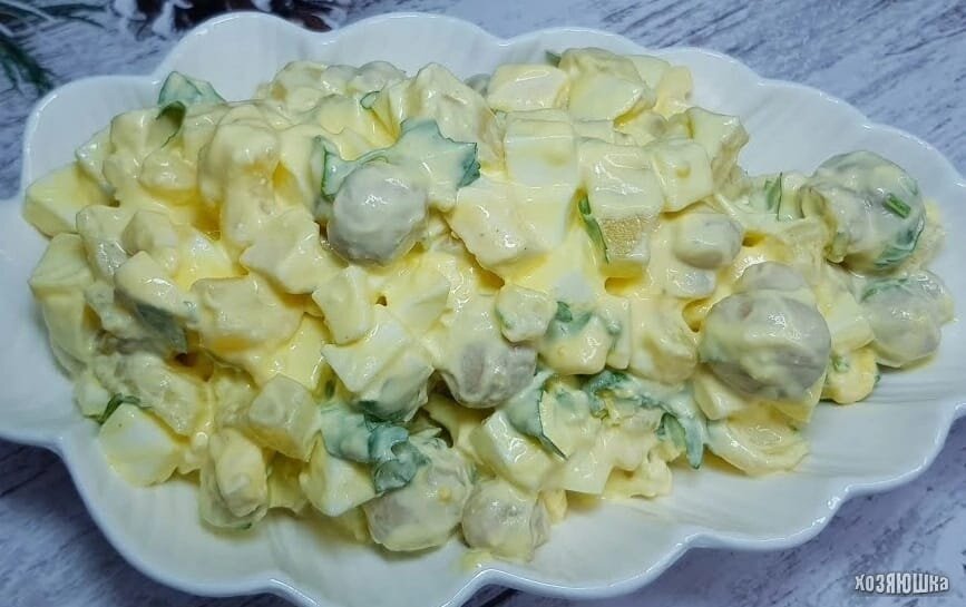 Сытный и аппетитный. Быстро и легко в приготовление. Ингредиенты: 200 грамм маринованных шампиньонов; 2-3 яйца (отварить); 1 плавленный сыр; 4 кольца ананаса консервированного; Укроп или петрушка; Соль по вкусу; Майонез; Приготовление: Яйца, сыр, ананас и грибы нарезаем кубиком. Если грубы маленькие, то можно оставить целыми. Все смешиваем, добавляем мелко нарезанную зелень, соль, майонез и хорошо перемешиваем.