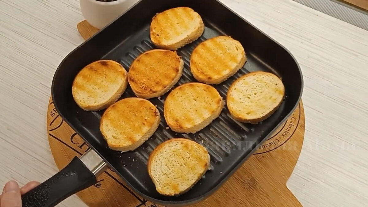 Выбираем батон или багет и нарезаем ломтиками. Обжариваем ломтики на сухой сковороде до румяного цвета. У меня под рукой была сковорода гриль и ломтики получились полосатые :)