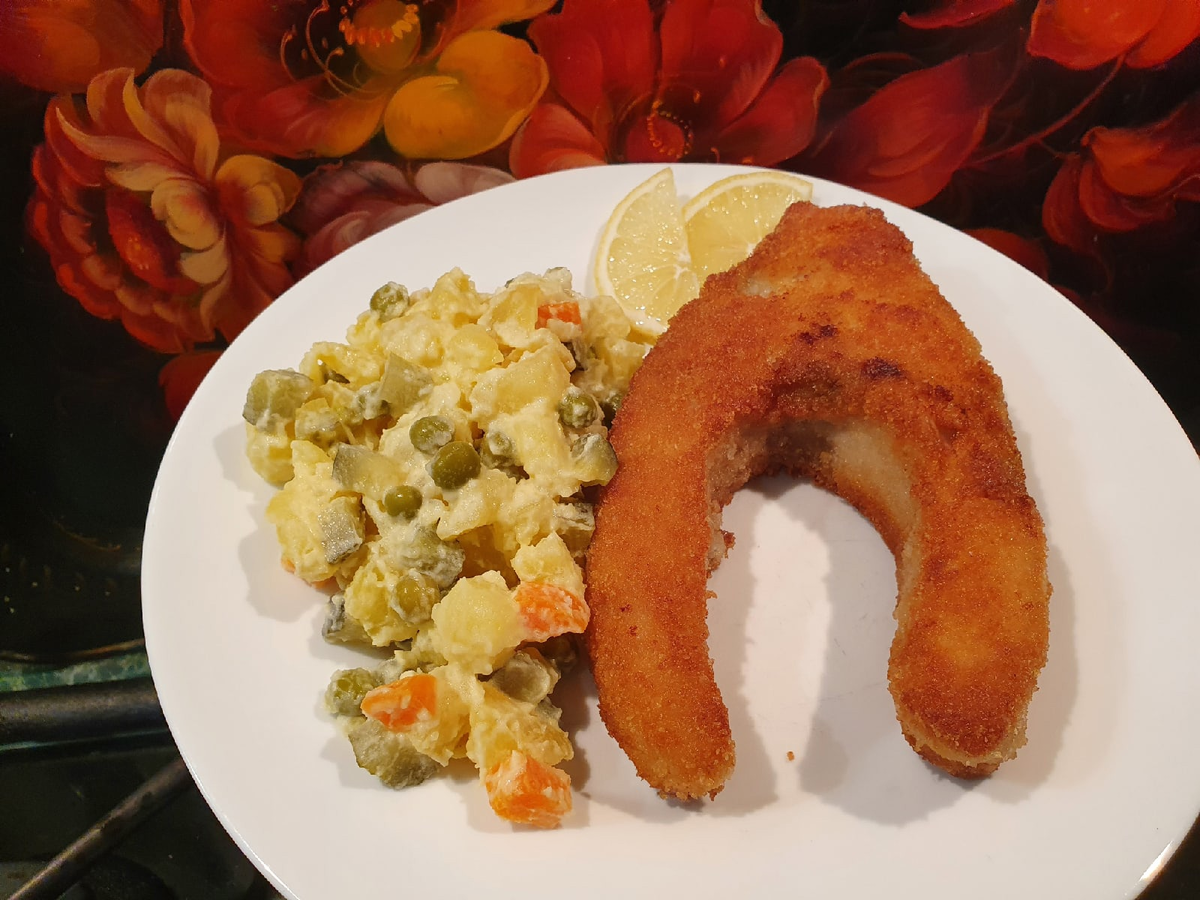 Сегодня я расскажу как приготовить карпа по классическому чешскому рецепту. Но будьте очень внимательны во время еды, потому что из-за этого блюда каждый год десятки чехов обращаются за медицинской помощью! Нам понадобится: — карп; — 2 яйца; — 300 мл молока; — мука; — панировочные сухари; — соль, перец, лимон; — подсолнечное масло для жарки; для салата: — картошка; — морковь; — консервированный горошек; — соленые огурцы; — рассол от огурцов; — майонез; — соль, перец; Приготовление: Начнем с салата. 1. Ставим вариться картошку в мундире и морковку. Картошки надо взять в 4 раза больше, чем моркови.