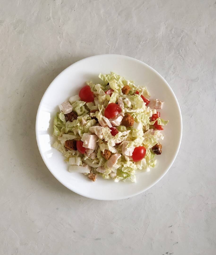 Ингредиенты: копчёная грудинка, листья пекинской капусты, помидоры черри, сыр тертый, сухарики "Кириешки" ржаные со вкусом ветчины и сыра, майонез Способ приготовления: Нарезать капусту. Помидоры черри нарезать на 4 части. Копчёную грудку нарезать кубиками. Сыр натереть на тёрке. Все смешать, заправить майонезом.