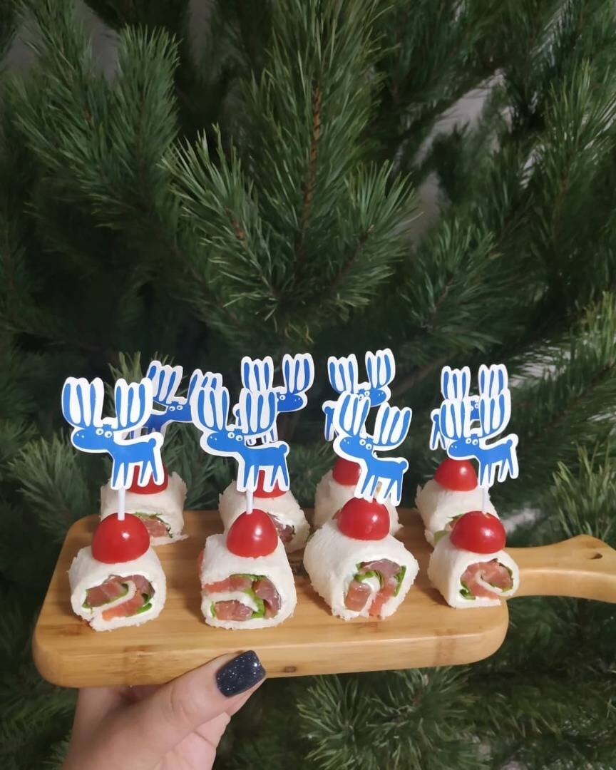 #новогодниеканапе Ингредиенты: ✔️Красная рыба слабосолёная, ✔️Хлеб тостовой, ✔️ Творожный сыр, ✔️Листья салата, ✔️Помидорки черри Способ приготовления: Приготовление Тостовой хлеб обрезать по краям и раскатать в тонкий пласт. Рыбу нарезать на полоски. Раскатанный хлеб смазать творожным сыром, сверху положить лист салата, на него рыбку и свернуть все в рулет. Рулет порезать на равные канапе. Каждое канапе украсить помидоркой черри. Закрепить шпажкой🍢