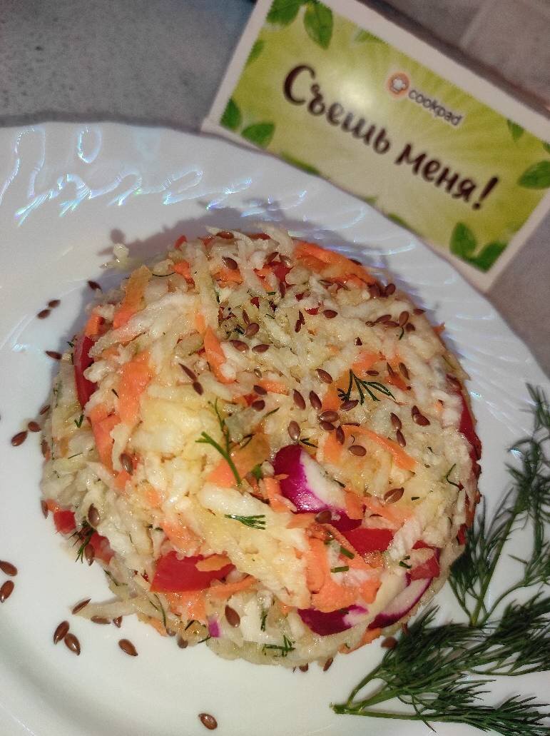 #салатизредьки #салат #готовитolya_vas Ингредиенты: - редька зелёная, - морковь, - помидор, - редиска, укропа, соль, смесь 4 перца, масло растительное, семена льна Способ приготовления: Редьку и морковь натереть на крупной тёрке. Редиску и помидоры нарезать соломкой. Укроп мелко нарезать. Все подготовленные ингредиенты соединить, посолить, поперчить, добавить масло, перемешать. При подаче посыпать семенами льна. Готово. ПРИЯТНОГО АППЕТИТА!