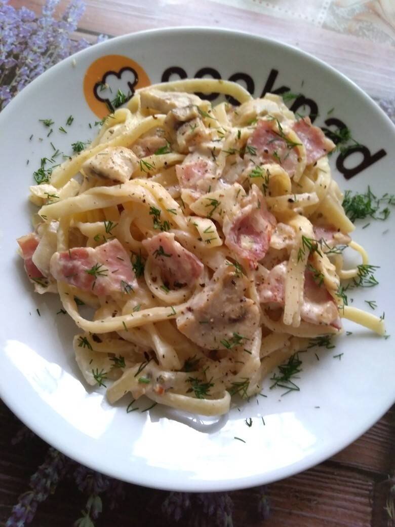 Лучше пасты может быть только паста с вкусным соусом 😋 #макароны Ингредиенты: отварных тальятелле или любой другой пасты, бекона, шампиньон, небольшой луковицы, сливок, Соль, перец, орегано , Зелень по желанию, пармезана Способ приготовления: Лук мелко нарезать, бекон нарезать, как любите, у меня средними кусочками Грибы нарезать ломтиками. Обжарить все вместе на растительном масле около 5 минут (бекон и лук должны немного зарумяниться). Сливки подогреть. Бекон и грибы приправить солью по вкусу, перцем и орегано. Затем влить в грибы с беконом горячие сливки, через 2-3 минуты всыпать мелко натертый пармезан, хорошо перемешать до растворения сыра. В получившийся соус выложить готовую пасту, перемешать, потомить на медленном огне 3-5 минут, чтобы паста пропиталась. При подаче можно украсть зеленью. Приятного аппетита!