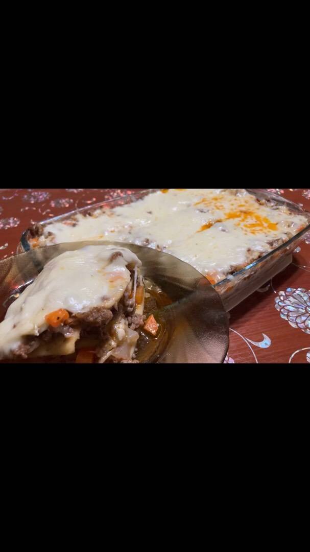 Ингредиенты: Фарш, Лук, Морковь, Помидоры, Специи на ваш вкус, Вода, Растительное масло для жарки, Соус Бешамель: , Сливочное масло , Мука , Молоко , Соль, черный перец , Сыр для верхнего слоя лазаньи Способ приготовления: Фарш, лук, морковь, помидоры обжариваем и добавляем специи и воды, тушить 15 минут. Соус бешамель: на сливочном масле обжариваем муку и добавляем молока, соус должен загустеть, затем добавляем черный перец. Соус не доводим до кипения! Тесто для лазанья купила в магазине))) Собираем лазанью и на 30 мин 200 гр в духовку, за 5 минут до готовности добавляем сыр 🧀🥰