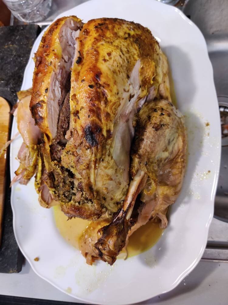 Индейка на рождество это главное блюдо ,поэтому его надо готовить правильно #французкаякухня Ингредиенты: Индейка, Говядина мякоть , Пупочки куриные , яйцо, Лук, Масло сливочное , Зелень петрушка и кинза, Куркума , Тмин , Базилик , Манка , Чеснок, яйцо, панировочных сухарей, горчицы, меда, Имбирь Способ приготовления: Индейку помыть, хорошо натереть манкой, чтобы отвалились самые мелкие пёрышки которых почти не видно, натереть куркумой, базиликом, нашпиговать под кожу и в мясо нарезанным чесноком, отложить отдыхать. Готовим фарш, мясо поперчить, посолить и в мясорубку, пупочки заранее отварить (у меня готовая упаковка отваренных) и тоже в мясорубку, добавить яйцо, 1 ст.лож. панировочных сухариков, поперчить, посолить и смешать фарш, открыть консервированные каштаны, добавить так чтобы каштаны не ломались. Наполняем фаршем и каштанами индейку и закалываем зубочистками. Помещаем индейку в латку и готовим смесь для поливки /имбирь горчица и мед хорошо смешать /намазать поверх индейки. Зап