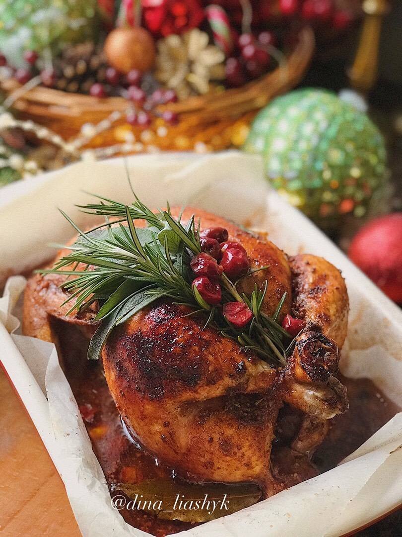 #святковеменю #гаряче Друзья, всем привет! Сегодня предлагаю вам отличный вариант нежной, сочной и очень вкусной курочки для новогоднего стола. Сохраняйте рецепт и готовьте с удовольствием ❤️ Ингредиенты: 🔸курочка бройлера, 🔸чеснок , 🔸сухой тимьян , 🔸копчёная паприка , 🔸хмели-сунели, 🔸дижонская горчица, 🔸соль , 🔸лист лавровый , 🔸оливковое масло , 🔸сахар , 🔸свежая или замороженная вишня , 🔸красное сухое вино Способ приготовления: ☑️ Курочку сутки выдерживаем в рассоле в холодильнике. Для этого кладем курицу в кастрюлю и заливаем холодной водой так, чтобы вода полностью покрыла тушку. Добавляем 2 ст. л. соли и 1/2 ст. л. специй для курицы, 2 лавровых листа. ☑️ Перед приготовлением вынимаем курицу и хорошо обсушиваем с помощью бумажных полотенец. ☑️ В глубокую форму для запекания выкладываем вишню, лавровый лист, чеснок и сахар. ☑️ Далее наливаем вино и сверху кладём куриную тушку. Ножки у курочки желательно связать бечёвкой. ☑️ В маленькой пиале смешиваем хмели-сунели, копчён