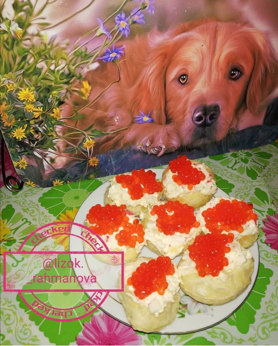 Ингредиенты: Слоёное тесто, Крабовые палочки, Плавленый сыр, Яйца, Чеснока, Майонез, Икра для украшения Способ приготовления: Слоёное тесто раскатать, вырезаем небольшие кружочки. Выпекаем в разогретой духовке при 200 градусов минут 15 (смотрите на свою духовку). Пока выпекаются наши заготовки приготовим начинку. Крабовые палочки режем мелкими кубиками, сыр и яйца натереть на мелкой тёрке, добавляем мелко резаный чеснок. Заправляем майонезом, все хорошо перемешиваем. Готовой начинкой смазываем наши кружочки, украшаем икрой и подаём к столу. Приятного аппетита.