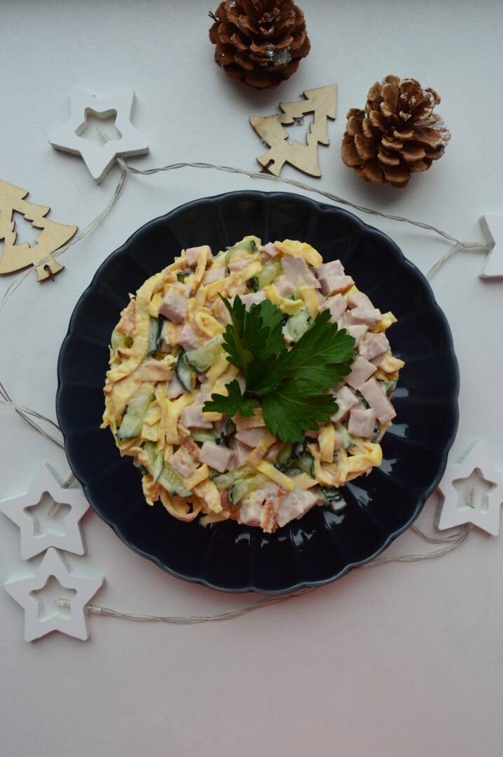В моем детстве без этого салата не обходилась ни одна гуляночка, вот реально, не важно где мы праздновали, дома или в гостях, этот салат всегда был на столе 😁 Люблю я его до сих пор 😁 Подробный видео рецепт можно найти в Инстаграм batonobelka #новогоднее меню #меню Ингредиенты: яйца, кукурузного крахмала, ветчины/молочной колбасы, огурец, сметаны , майонеза, соль, перец , растительного масла, чеснока Способ приготовления: 1. Делаем блины. В чашке смешиваем яйца, кукурузный крахмал, соль, перец, все хорошо венчиком взболтать. 2. Сковородку разогреваем, немного смазываем масло, выливаем небольшое количество смеси и жарим блинчик с обеих сторон до золотистого цвета. У меня получилось 6 блинов. 3. Ветчину/колбасу нарезаем на небольшие кубики, огурец нарезаем на полоски. 4. Остывшие блины сворачиваем пополам и режем не сильно толстыми полосками. 5. Смешиваем все в общей чашке, добавляем сметану и майонез, соль, перец, все перемешиваем. Убираем в холодильник, чтобы пропитался. Готовый сала
