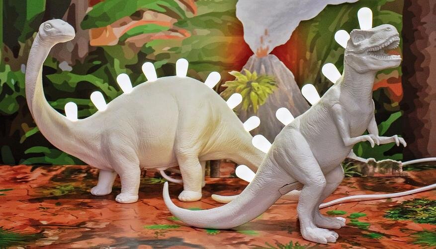 Еще один оригинальный настольный светильник в виде достаточно крупной фигуры динозавра. На выбор либо диплодок с флегматичной физиономией, либо «улыбающийся» тираннозавр. Размер светильников: 50x20x30см или 40x14x34см. Осветительными элементами являются небольшие лампочки идущие вдоль хребта динозавра.