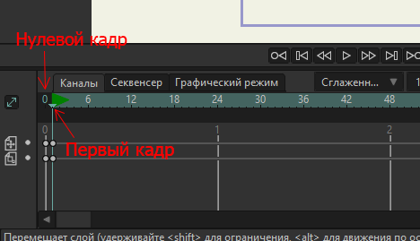 В прошлом уроке мы создали примитивного персонажа. У него нет скелета и он состоит из всего одного слоя, но этого достаточно, чтобы продемонстрировать основы анимации в moho. Чтобы было проще понять, что мы делаем, я обозначу цели урока: Прежде чем начнём анимировать, я должен пояснить некоторые нюансы. Вы могли заметить внизу временную шкалу (таймлайн), на которой есть цифры: 6, 12, 24, 30... (это кадры). На временной шкале находится курсор, показывающий, на каком моменте анимации мы находимся. Так вот, всё, что относится именно к созданию объектов, делается только на НУЛЕВОМ КАДРЕ. На нулевом кадре вы можете как угодно расставлять объекты, хоть по возрастанию, нулевой кадр не относится к анимации. Анимация начинается с первого кадра. 1. Движение - жизнь Итак, у нас есть объект и его нужно передвинуть из правого края сцены в левый. Для начала ставим курсор на первый кадр. Двигать курсор можно кнопками влево и вправо, либо потянув левой кнопкой мыши. Теперь берём инструмент "Трансфор