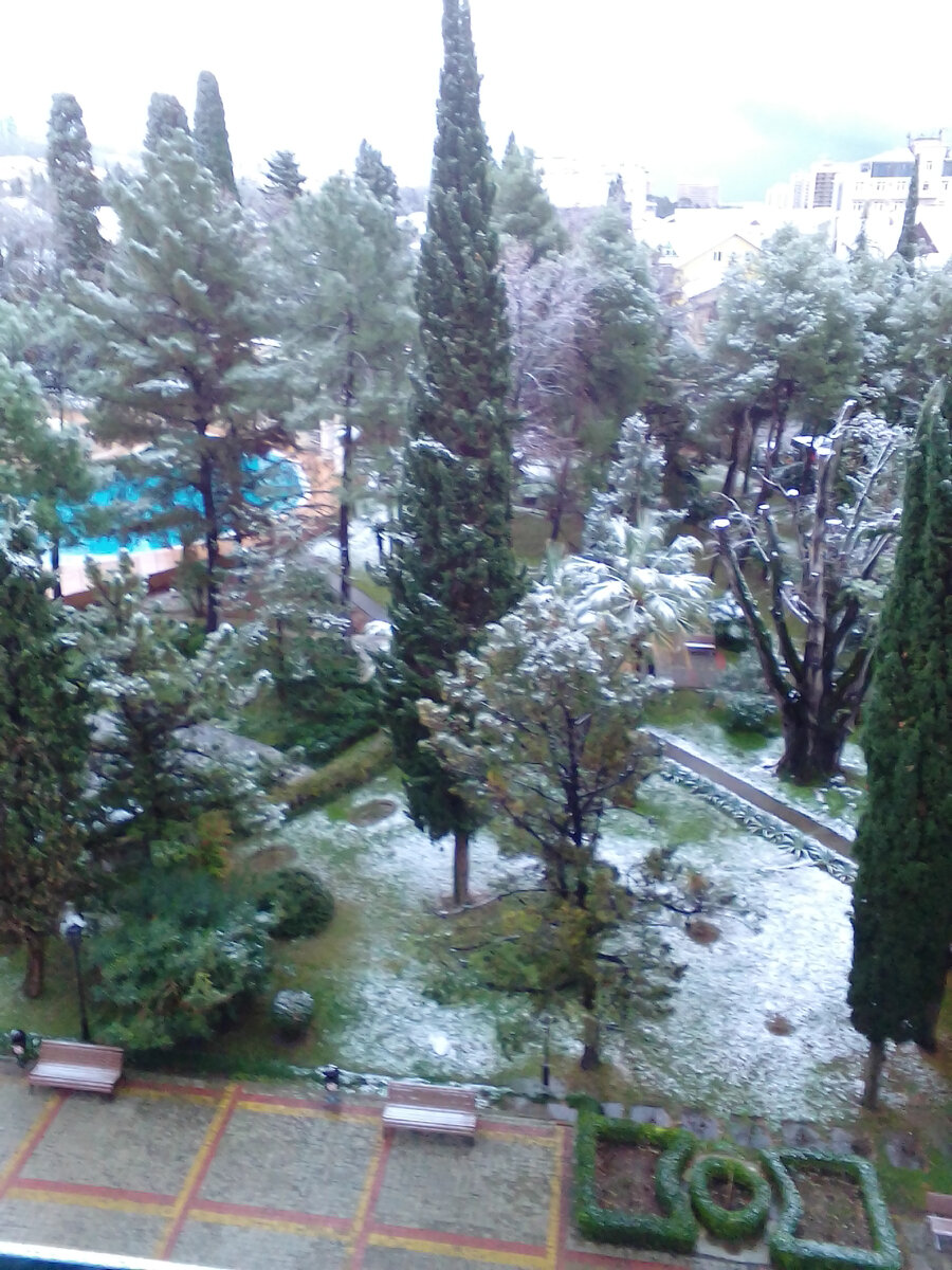 Приехали мы 20 декабря в Адлер. Дождь, не слишком тепло, море сильно штормит. На следующий день выглядывало солнце, но не надолго, и все равно было прохладно. А вот утром 22 декабря мы увидели следующую картину: все в снегу, ночью и утром снег валил просто хлопьями. В течение дня снег прекращался, и казалось, что вот-вот выйдет солнце, погода наладится, но буквально в момент небо опять заволакивало черными тучами и начиналась метель. Утром 23 декабря мы увидели, что снега стало еще больше. Если накануне снег быстро подтаивал, то теперь он собирался лежать долго, температура была около 0 или небольшой минус. 24 декабря осадки наконец-то закончились, но теплее не становилось. Снег лежал и на пляже, галька замерзла, не рассыпалась под ногами, когда по ней ходишь, и местами было скользко. Потом все же вышло солнце и надолго. Наконец-то начал таять снег, хотя в тени он все равно остается лежать нетронутым. А на солнце поспешили выйти все и люди, и птицы и животные. В ближайшие дни обещаю