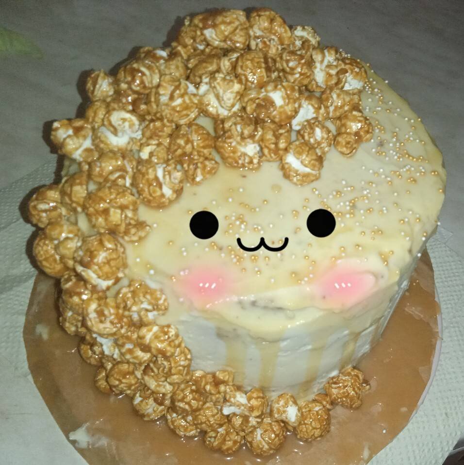 Очень вкусно и сладко ❤️❤️🍿🍿 Ингредиенты: Яйца, Сахар, Вареное сгущённое молоко, Растительное масло, Мука, Разрыхлитель , Сироп, Вода, Сахар, Крем, Сливочное масло, Сахарная пудра, Сливочный сыр, Сливочная карамель, Попкорн в карамели, Сливочная карамель, Сахар, Сливки 33% , Сливочное масло Способ приготовления: Для бисквита яйца взбить с сахаром в пышную массу. Продолжая взбивать, добавить вареное сгущенное молоко и растительное масло. Всыпать просеянную муку, разрыхлитель, замесить тесто. Тесто разделить на две части. Каждую выложить в форму, выстеленную промасленным пергаментом. Выпекать в духовке при температуре 180 °C около 30 минут. Проверить готовность шпажкой – она должна остаться сухой. Бисквиты остудить. Каждый разрезать на 2 коржа. В центре двух коржей вырезать окружность диаметром 6 см. Приготовить сироп из воды и сахара, пропитать коржи. Для карамели растопить сахар до карамельного цвета, добавить горячие сливки и сливочное масло, прогреть, остудить. Для крема сливочное