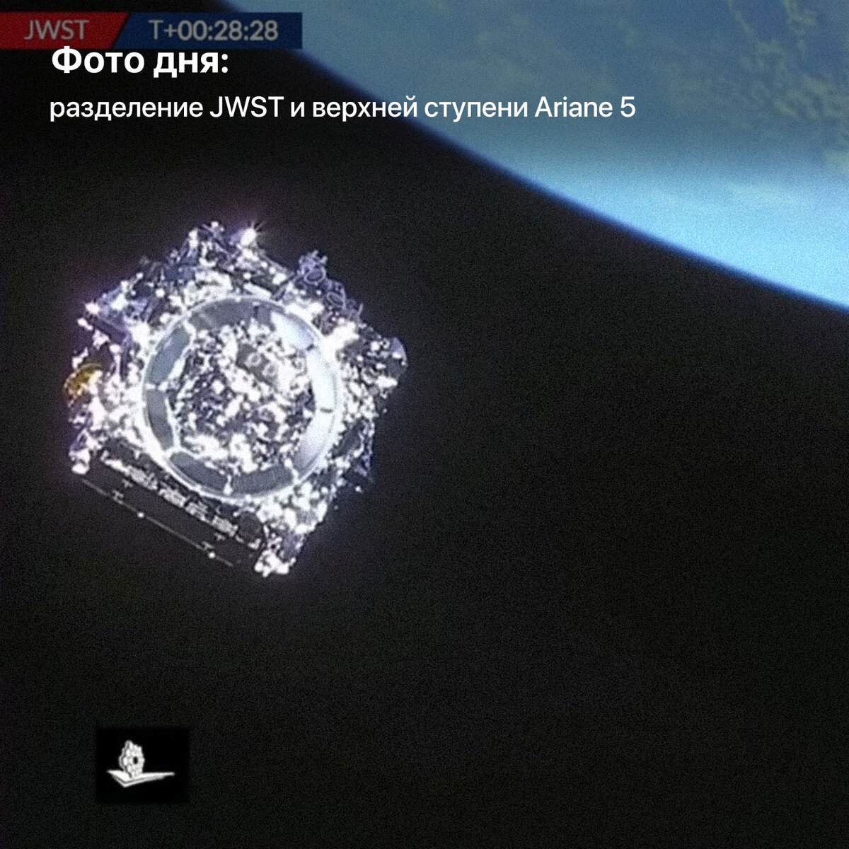 Телескоп имени Джеймса Уэбба отделился от верхней ступени ракеты-носителя Ariane 5. Через минуту была развёрнута солнечная панель. Начинается самостоятельный 30-дневный полёт к точке L2. Глава NASA Билл Нельсон поздравил ESA с успешным запуском «машины времени». Снимок сделан 25 декабря 2021 года через 27 минут после старта.