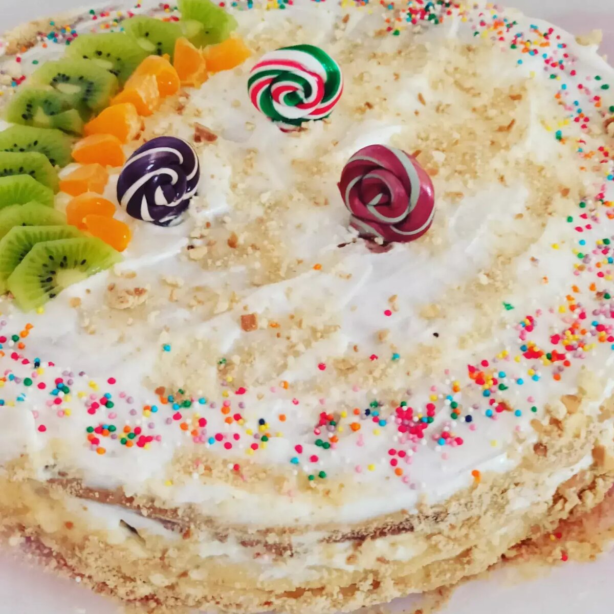 Рецепт очень вкусного медовика. Получается очень нежный. Наш семейный рецепт. Ингредиенты: муки, яйца, сахара, мёда, сливочного масла, соды, соли, сметаны, сливок, сахарной пудры, ванилина, сливочного масла, сгущённого молока, ванилина Способ приготовления: Приготовление теста : взбиваем яйца с сахаром до пышной массы. Переливаем в сотейник с толстым дном и добавляем масло с мёдом. Ставим на медленный огонь, постоянно помешивая, не доводя до кипения, до появления первых пузырьков. Снимаем с огня и добавляем соду и хорошо перемешиваем, добавляем муку и также перемешиваем. Замешиваем тесто и делим его на 8 частей. Заворачиваем его в плёнку и убираем на час в холодильник. После раскатываем и выпекаем на 200 градусах до золотистости. Приготовление первого крема: сметану взбиваем с половиной сахарной пудры и ванилином, до пышной массы. Отдельно взбиваем сливки с сахарной пудрой до пышной массы. Всё соединяем на большой скорости миксера. Приготовление второго крема: всё взбиваем до пышной од