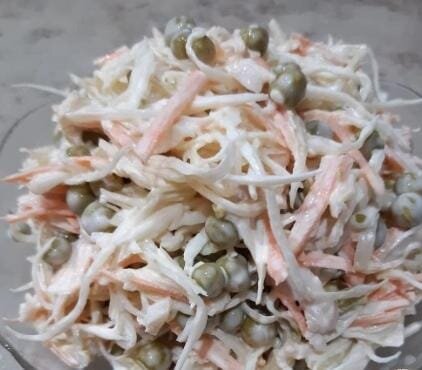 Вкусный и сытный салат из капусты, куриного филе и зеленого горошка. Набор продуктов минимальный и наверняка найдется в каждой семье. Готовиться буквально 5 минут ( при наличие уже сваренного куриного филе). Лук нарезаю тонкими полукольцами и мариную (в теплой воде с добавлением яблочного уксуса и соевого соуса). Лук получается не острым, вкусным и сочным. Добавляю немного соли, майонеза и хорошо вымешиваю. Салат готов.