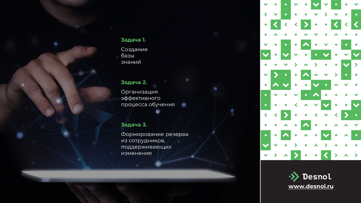 - Создание базы знаний, позволяющей эффективно вводить в должность сотрудников, а также предоставлять им индивидуальные возможности для профессионального и карьерного роста.