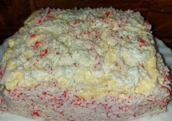 Закусочный торт "Снегурочка" Готовила в прошлом году на праздный стол, оценили все. И за вечер весь тортик и съели. В этом году буду готовить снова! Нам потребуется: крабовые палочки - 250 грамм; яйца куриные - 4 штуки.; сыр твёрдый - 200 грамм; майонез - 3 столовой ложки; чеснок - 2 зубчика. Сыр натрите на мелкой тёрке, выложите в глубокую миску, сюда же пропустите через пресс (или натрите) зубчики чеснока. Куриные яйца отварите вкрутую (на отваривание с момента закипания воды потребуется минут 9-10), затем полностью остудите их и очистите. Разделите каждое яйцо на белки и желтки. Желтки натрите на мелкой тёрке в миску к сыру с чесноком. К сыру, чесноку и желткам добавьте 2 столовые ложки майонеза и перемешайте сырную начинку для нашего тортика. Яичные белки натрите на мелкой терке в отдельную посуду и отложите пока в сторону. Все крабовые палочки разверните, чтобы получились плоские квадратные листы. На блюдо (или подходящую тарелку), на которой будем подавать закусочный то