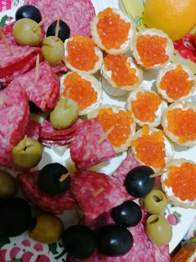 #новыйгод Ингредиенты: Сыр, Колбаса, Оливки, Творожный сыр, Красная икра Способ приготовления: Для канапе можно использовать любые ингредиенты. В тарталетки кладу творожный сыр, сверху красную икру. Делаю различные канапешки (сыр, колбасная нарезка, оливки....)