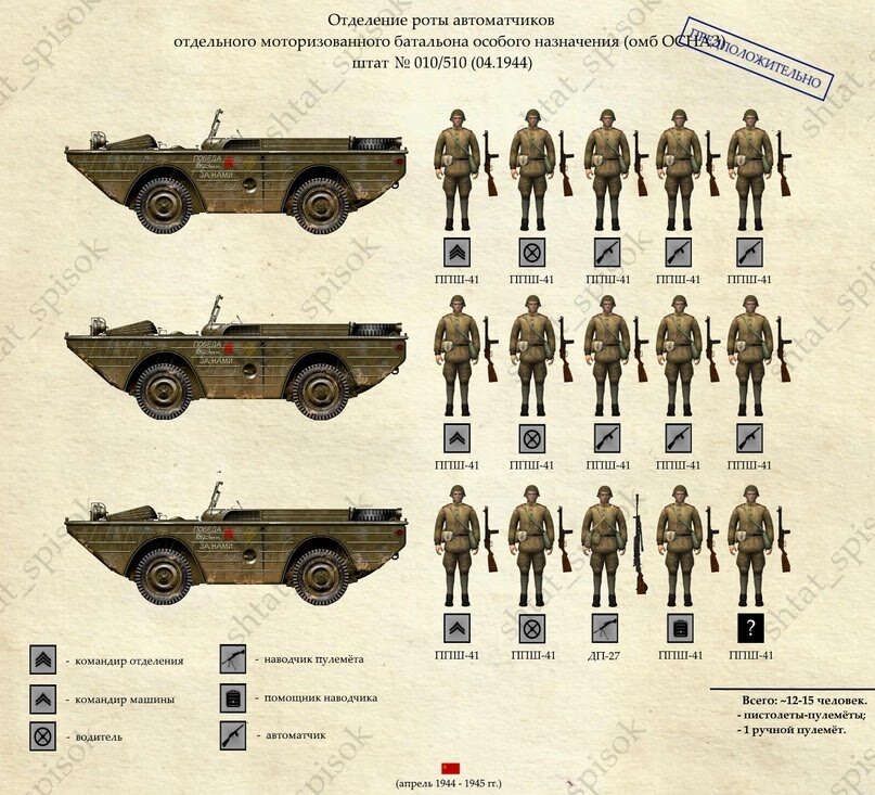 Предположительно, на взвод автоматчиков полагалось 10 машин — по 3 для каждого отделения и машина командира взвода (в которой, кроме водителя и комвзвода, похоже, был ещё как минимум связной, и, возможно, помощник командира взвода).