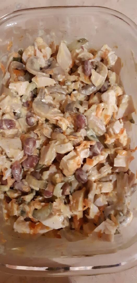 Быстро, вкусно и бюджетно. Ингредиенты: консервированных нарезанных шампиньонов, красной консервированной фасоли в собственном соку, Куриная грудка (отварная или копчёная или запеченная), Огурцы солёные, Морковь и головка репчатого лука, Майонез, Соль и специи Способ приготовления: Подготовить куриную грудку, порезать произвольно кусочками, можно разволокнить. Очистить морковь, натереть на крупной терке. Луковицу очистить, порезать кубиками, соединить с морковью и пассеровать в сковороде с добавлением растительного масла. Остудить. Огурцы порезать соломкой. Соединяем все ингредиенты, солим, добавляем специи и заправляем майонезом. Салат готов! Приятного аппетита!