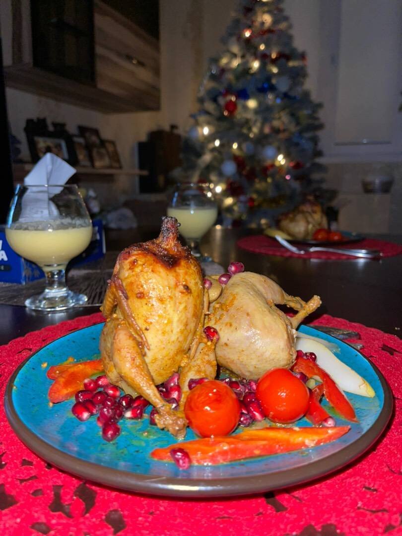 Вполне себе блюдо на #новыйгод , очень нежное сочное и может занять центральное место на вашем праздничном столе. Ингредиенты: Перепёлки, груша мягкая, Помидоры Черри, Сладкий перец болгарский, Маринад, Апельсиновая цедра (целого апельсина), Горчица , Сливочное масло , Соевый соус , Специи, Красный молотый перец, Чёрный молотый перец, Куркума, Сок 1 дольки апельсина Способ приготовления: Помыть перепелок просушить их. Готовим маринад : куркума + перец + цедру с апельсина (только цедру надо чтоб не горчило) + соевые соус + сливочное масло предварительно растопленное все смешать. Натереть перепелок даже постараться под шкурку втереть маринад. Оставить на час просто при комнатной температуре можно накрыть крышкой или пищевой плёнкой. Предварительно порезать овощи уложить на пергамент в жаропрочную посуду усадить туда перепелок сидя (я их «посадила» благодаря тому что завязала им лапки) Отправляем в духовку, сначала можно накрыть фольгой и снять фольгу спустя 20 минут держим температуру 18
