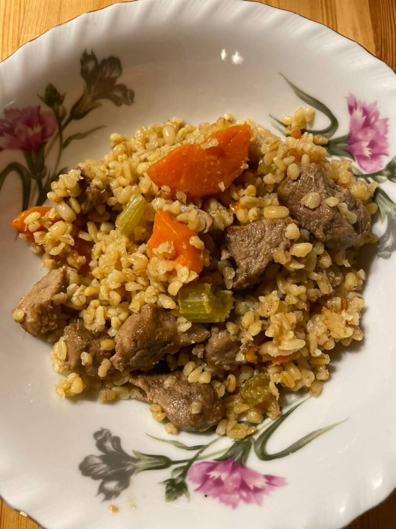 Готовим баранину с булгуром, можете называть пловом, кому как нравится Ингредиенты: мякоть баранины, булгур, лук, морковь, курдюк, стебель сельдерея, чеснока, соль, копченая паприка, чёрный молотый перец по вкусу Способ приготовления: Итак, готовить будем по технологии плова, при этом постараемся сделать блюдо по вкусу и аромату максимально не похожим на плов. Лук режем полукольцам, курдюк кубиками, морковь кольцами. Мякоть баранины (я беру обычно нижнюю половину задней ноги, ее проще разделать и костей там всего две небольшие) режем небольшими кусочками. Булгур промываем и замачиваем. Огонь на максимум. Растапливаем курдюк, вынимаем шкварки, кладём лук, жарим до золотистого цвета. Добавляем к луку мясо, обжариваем долго. Добавляем к мясу морковь и мелко порезанный сельдерей, а так же чеснок мелко порубленный. Я вообще думаю что можно было бы на этом этапе добавить болгарский перец желтый или красный, он придал бы цвета, а так же имбирь, чтобы сделать наше блюдо ароматнее и теплее. Жар