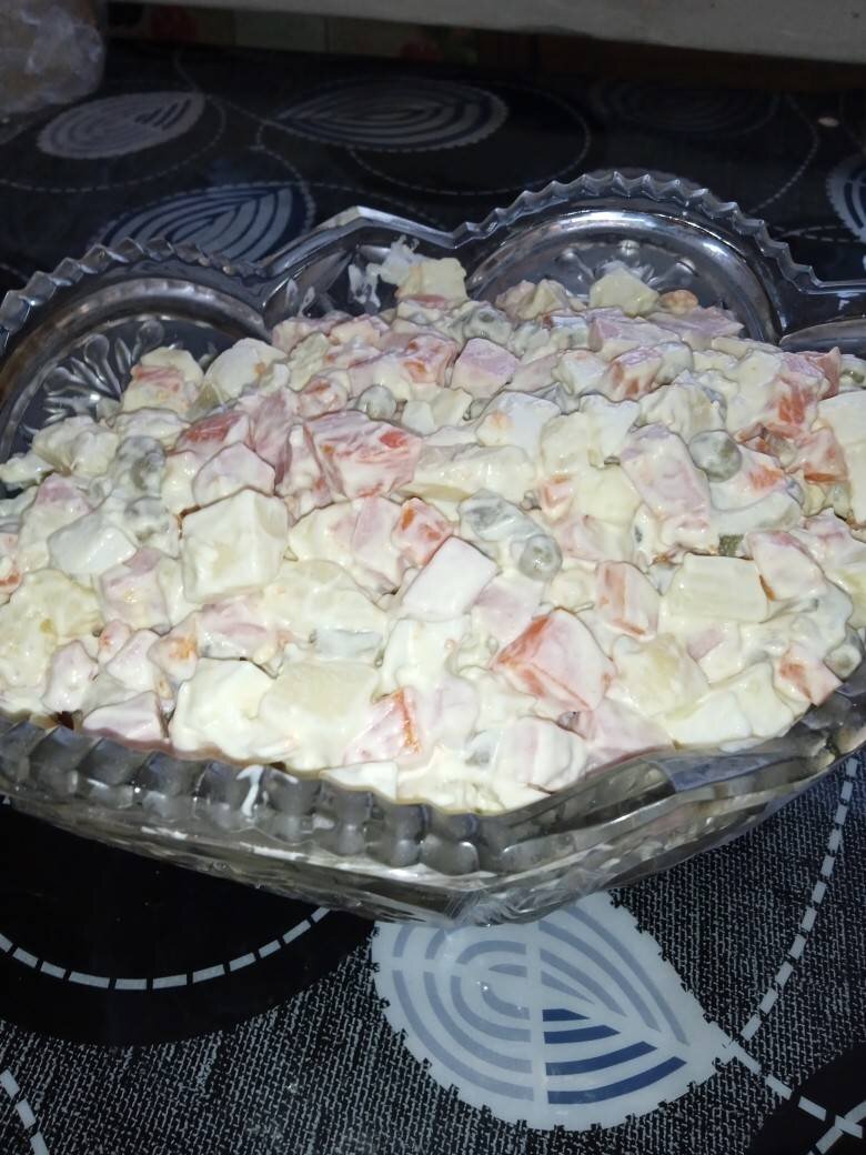 День рождения у дочери. Ингредиенты: колбаса вареная, картофель отварной, морковь отварная, яйцо, горошек зелёный, огурцы консервированные, майонез Способ приготовления: Все нарезать кубиком. И еще. Добавляем горошек и майонез, перемешать.