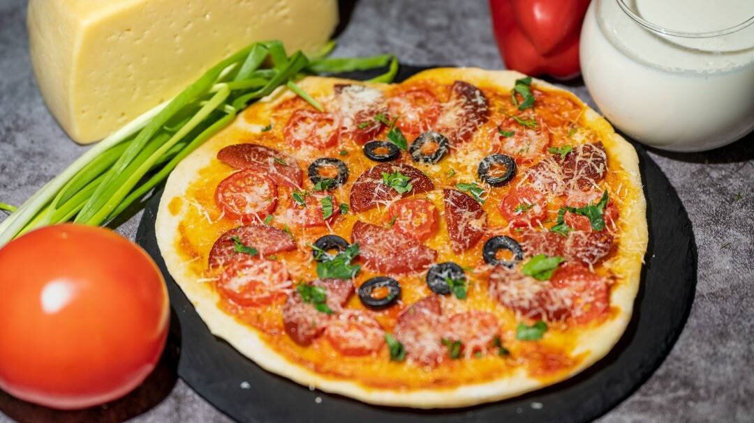 Замечательный рецепт быстрого приготовления ароматной мини-пиццы из дрожжевого теста с салями, помидорами с сыром и маслинами в микроволновой печи, которая приятно удивит своими великолепными вкусовыми качествами! Ингредиенты: На тесто для пиццы:, Теплая вода, Пшеничная мука , Сухие дрожжи , Растительное масло , Сахар , Соль , На приготовление соуса:, Кетчуп (томатная паста), Майонез , На приготовление 1 пиццы:, Колбаса салями , Маслины, Томаты черри, Сыр пармезан , Зелень , На чесночную заливку:, Чеснок, Растительное масло (оливковое) Способ приготовления: Для приготовления теста на пиццу высыпаем в большую миску с просеянной пшеничной мукой высшего сорта 1/3 чайной ложки сухих быстродействующих дрожжей, затем добавляем в нее щепотку соли, щепотку сахара и перемешиваем все ингредиенты. Выливаем в большую миску 100 миллилитров теплой кипяченой воды, 2 столовых ложки растительного масла, затем высыпаем в нее муку и хорошо перемешиваем между собой все ингредиенты. Собираем тесто в миске