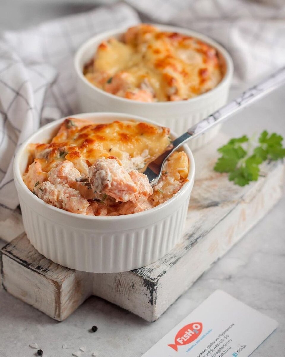 Ингредиенты: ✅300-400 г филе форели/сёмги ✅250 г лисичек ✅1 луковица ✅100 мл 20% сливок ✅1 ч.л. муки ✅50 г сыра ✅пучок петрушки ✅соль и перец по вкусу ⠀ Способ приготовления: 1️. Лисички промываем, нарезаем и обжариваем на небольшом количестве растительного масла в течение 15 минут. 2️. Филе форели нарезаем кубиками, мелко режем лук. Добавляем к грибам мелко лук и рыбу, обжариваем 5 минут, затем вливаем сливки, всыпать муку, измельченную петрушку, солим и перчим по вкусу, и обжариваем ещё 5-7 минут. 3️. Перекладываем получившуюся смесь в формы для запекания, посыпаем тёртым сыром и отправляем в разогретую духовку на 200°C до образования корочки. Можно заменить лисички шампиньонами, их можно не обжаривать заранее, а готовить сразу вместе с рыбой. ⠀ ПРИЯТНОГО АППЕТИТА!😌