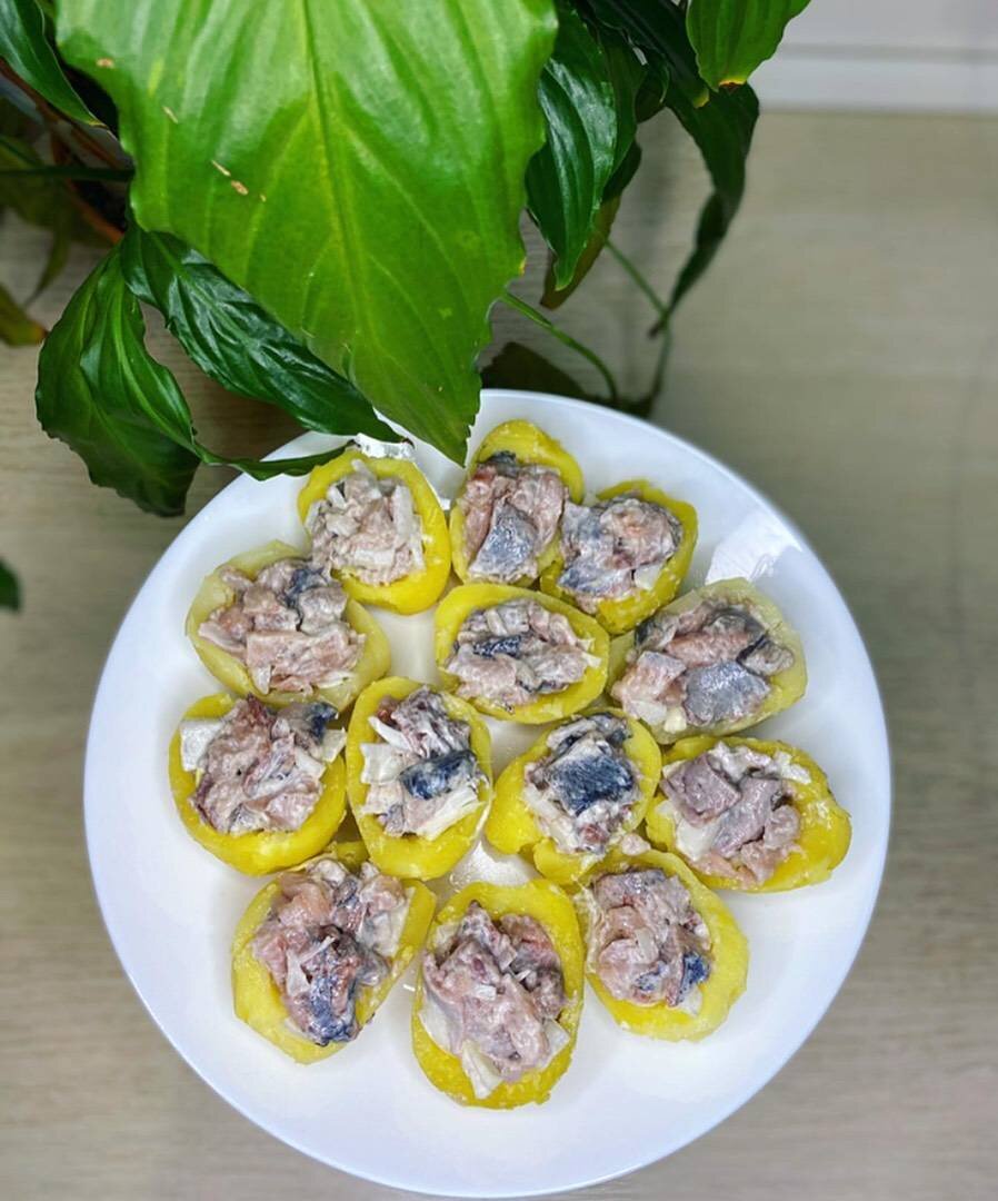 #святковеменю Ингредиенты: картофель, селедка, лук, майонез, соль Способ приготовления: Отвариваем картофель в мундире. Рыбу очищаем и нарезаем на небольшие кусочки. Лук нарезаем мелко и добавляем к рыбе. Вливаем немного майонеза, щепотку соли и перемешиваем. Готовый картофель очищаем от кожуры, разрезаем пополам и аккуратно очищаем серединку. Начиняем картофельные лодочки рыбной начинкой. Приятного аппетита!)