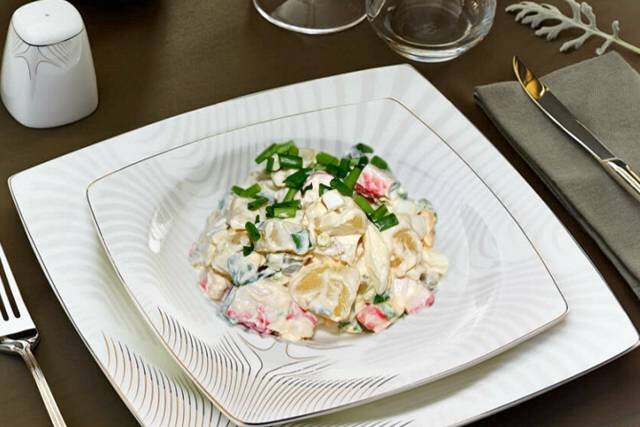 Рецепт для индукционной мультиварки с управлением по wi-fi. Ингредиенты: крабовых палочек, картофеля, зелёного лука, маринованных корнишонов, яйца С1, майонез «Провансаль» для заправки, соль, перец , воды для варки Способ приготовления: Яйца промыть и положить в чашу мультиварки. Можно использовать силиконовые формочки или коврик, чтобы не повредить покрытие. Влить воду. Картофель очистить. Нарезать на кубики и переложить в корзину-пароварку. Вставить стимер в чашу. В приложении Mi Home выбрать программу «Пропаривание и варка», установив время 15 минут. После сигнала достать пароварку с картофелем и яйца. Остудить. Зелёный лук мелко нарезать. Добавить картофель. Крабовые палочки нарезать кубиками и положить к остальным продуктам. Добавить нарезанные корнишоны. Яйца очистить, нарезать и положить в салат. По вкусу посолить и поперчить. Добавить майонез и перемешать. Подавать порционно, посыпав сверху зелёным луком.