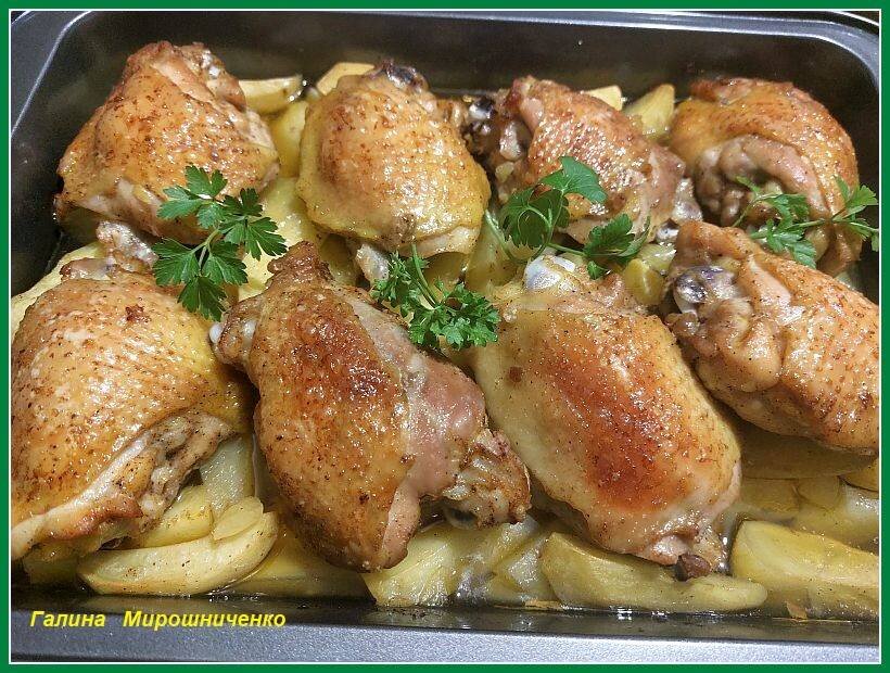 #новыйгод В качестве горячего блюда на Новогодний стол подойдут запеченные в духовке куриные бедра с картофелем. Преимущество этого блюда - 2 в 1 и готовится самостоятельно, а мы в это время облачаемся в праздничный наряд... Ингредиенты: куриных бедер, картофеля, растительного масла, соль, молотый перец, сладкая паприка, сухой чеснок , приправа для картофеля, лимонного сока Способ приготовления: Смешать соль, молотый перец, паприку, чеснок и лимонный сок. Этой смесью натереть куриные бедра и оставить мариноваться на 1 час. Перед готовкой очистить картофель, разрезать вдоль на 4 части. Смешать со специями для картофеля (или такой же смесью как мясо), сдобрить растительным маслом и выложить в форму для запекания. Куриные бедра смазать растительным маслом и разложить сверху картофеля. Запекать в разогретой до 180-200 градусов духовке 40-50 минут. В процессе готовки можно поливать выделившимся соком. Приятного аппетита!