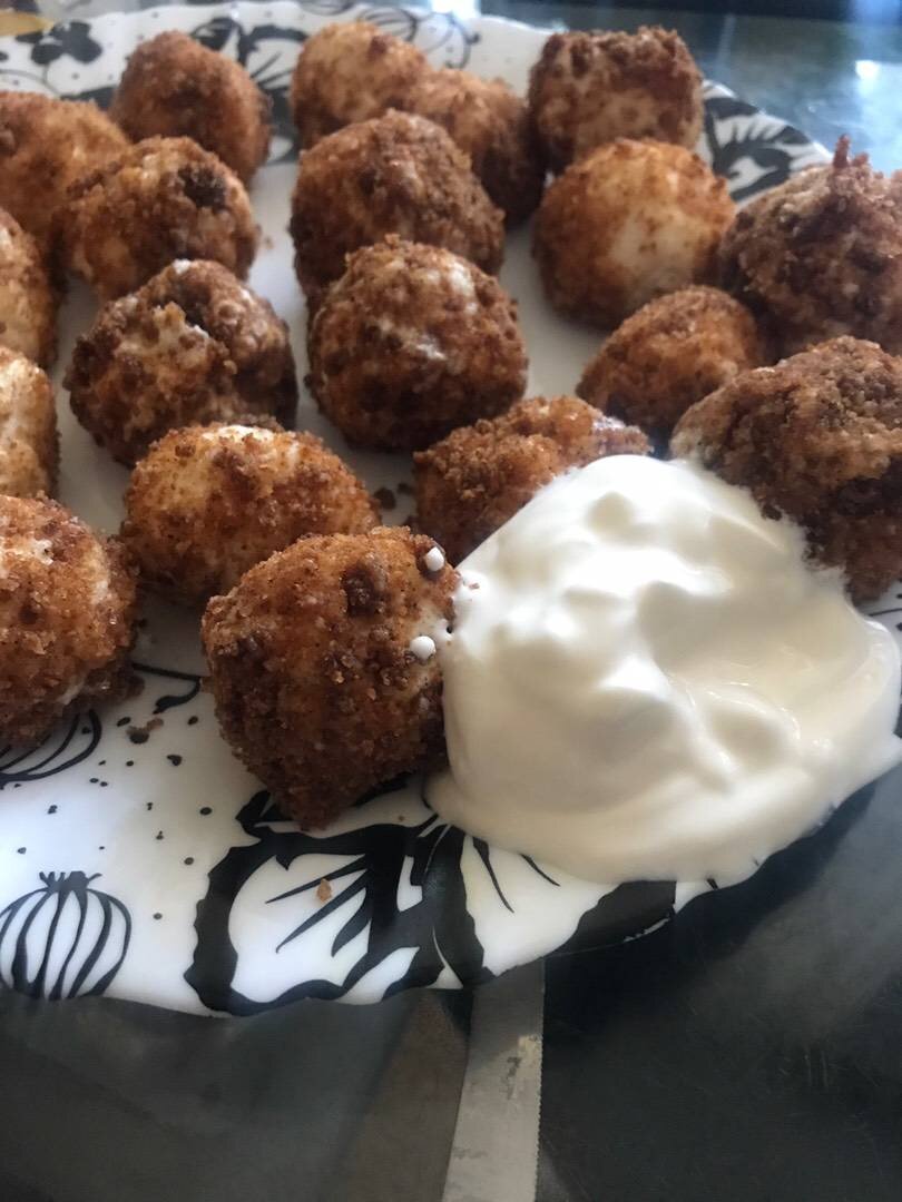 Ингредиенты: сиру (творог), манки, яйце, Цукру, солі, Присипка, панірувальних сухарів, вершкового масла, Цукор коричневий та кориця Способ приготовления: Перебити сир, додати манку, яйце, цукор, сіль перемішати і дати постояти 15 хв. Сухарі піджарити на маслі, додати цукор і корицю З сирної маси зробити кульки та зварити у підсоленій воді, коли спливли готові, дати стекти зайвій воді, обваляти в сухарях Подавати зі сметаною