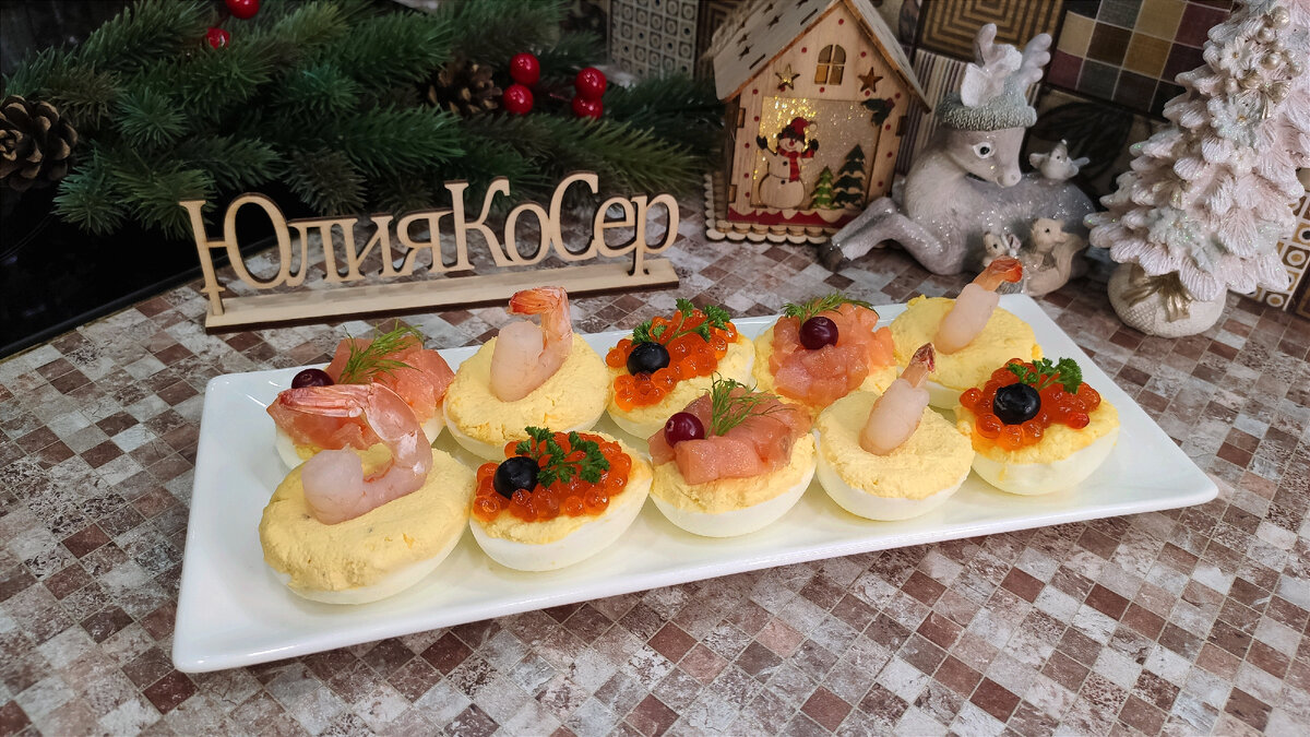 В этом видео я с Вами поделюсь рецептом классной закуски Фаршированные яйца с красной икрой, красной рыбой и креветками. Нам понадобится: Сваренных вкрутую яиц — 9шт.; Творожный сыр – 150гр.; Красная икра – 1 баночка; Красная рыба – 150гр.; Крупные готовые креветки — 6шт. Яйца аккуратно чистим от скорлупы, разрезаем пополам, отделяем желтки, отправляем в глубокую ёмкость. Соединяем желтки с творожным сыром, хорошо перемешиваем и начиняем этой массой половинки яиц. Рыбу режем мелким кубиком и выкладываем сверху на часть яиц. На остальные яйца выкладываем икру и креветки, украшаем зеленью и подаём. Фаршированные яйца готовы, они получаются очень вкусными, аппетитными и станут изюминкой вашего стола. Попробуйте их приготовить. Всем приятного аппетита. Желаю приятно провести новогодние праздники. Пусть ваши желания обязательно сбудутся. Для связи : miss.kolubaeva@gmail.com новогодний стол,новогодний стол 2022,новогоднее меню,стол 2022,праздничное меню,что приготовить на праздник,
