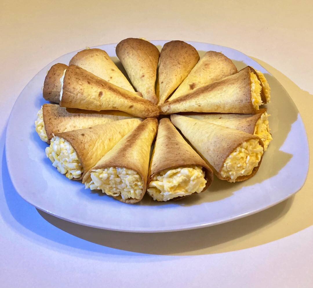Сегодня предлагаю приготовить интересные закусочные рожки из мексиканских лепёшек. Начинкой может послужить любой салат, я выбрала еврейский салатик. Рожки получаются хрустящими и ароматными. Готовьте с любовью ❤️ Ингредиенты: лепёшек «Тортилья» (4 шт);, плавленых сырка;, яйца сваренных вкрутую;, чеснока;, майонеза; Способ приготовления: Мексиканские лепёшки «Тортилья» разрезать на четыре части и включить разогреваться духовку до 200 градусов; Затем каждый кусочек лепешки свернуть в конус и закрепить зубочисткой. Из 4 лепёшек получается 16 штук. Теперь свёрнутые лепёшки в конусы переложить на сухой противень и отправить в разогретую духовку для выпекания на 10-15 минут; Пока выпекаются рожки, приготовить нужно начинку. Для этого плавленые сырки натереть на крупной тёрке; Зубок чеснока очистить и натереть на средней тёрке; Тёртый чеснок отправить к плавленым сыркам; Далее заранее сваренные вкрутую яйца натереть на средней тёрке, отправить к ингредиентам и добавить майонез; Все ингредиен