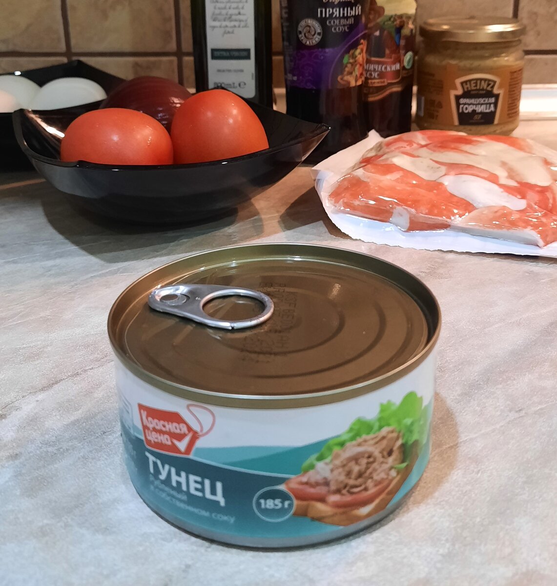 Сколько перечитала комментариев к рецептам салатов..типа ...фи-фи жирно и вредно, так как много майонеза, и решила сегодня поделиться интересной идеей приготовления салатика на праздник без всеми любимого майонеза))) Нам для салата потребуется: Баночка тунца в собственном соку - 185 г. + Помидор - 2 - 3 шт. + Красный лук - 0,5 головки + Яйца - 3 шт. + Крабовые палочки - 100 г. + Оливки-маслины - 0,5 баночки. Делаем в самом начале запрвку. Смешиваем Оливковое масло - 3 ст.л. + Соевый соус - 1 ст.л. + Бальзамический уксус - 1 ст.л. + Горчица французская - 1 ч.л. + Мед - 2 ч.л. Соль - 1 ч.л. На салатное блюдо выкладываем первым слоем нарезанные кубиком крабовые палочки или крабовое мясо. Далее яйца, нарезанные дольками. (яйца варила 7 минут, чтобы желток был немного мягким). Красный лук режем перьями и выкладываем на яйца. Сверху поливаем заправкой около 4 ч.л. (есть фото в галерее). Слой тунца и сверху на тунец мелко рубленную зелень по желанию. Последний слой - помидоры и оливки. Сдабри
