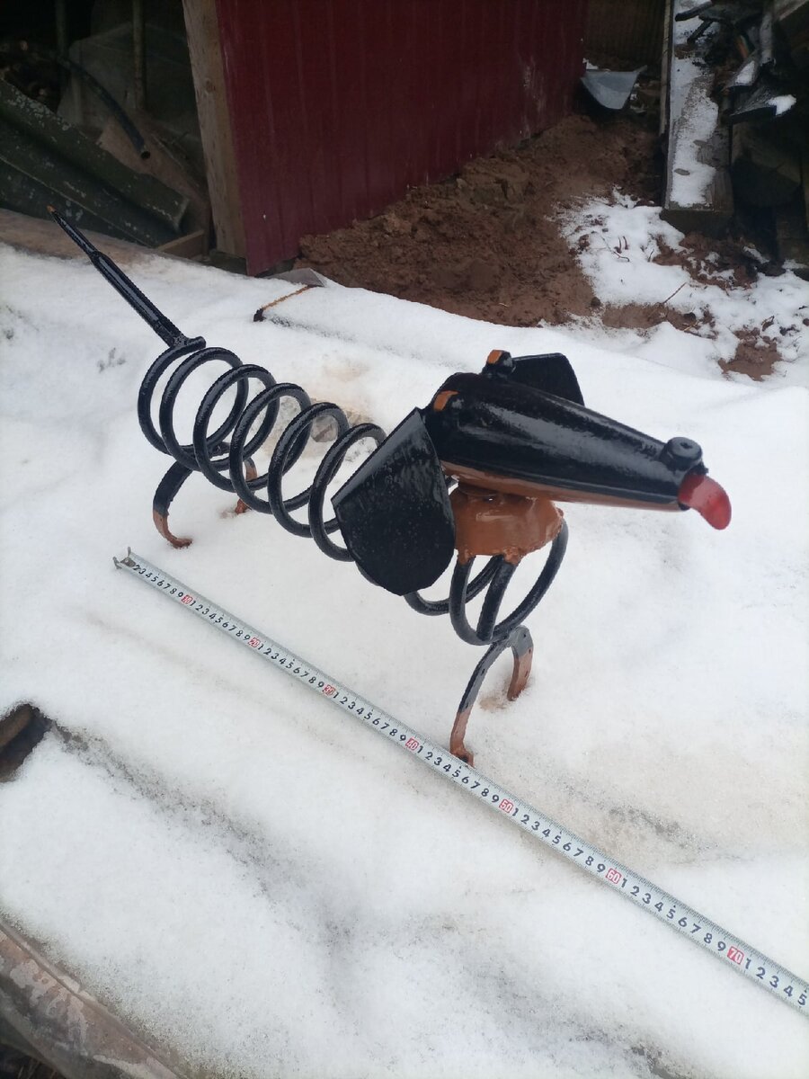 Здравствуйте. У меня в гараже постоянно скапливается всякий металлолом. То машину ремонтируешь и старую запчасть не выкинешь, то сломается какая нибудь вещь, ее тоже в гараж и т.д. Так и копится постоянно много не нужного железа. Раньше весь металл я сдавал на пункт приема металлолома. Какая никакая копеечка для семейного бюджета. Раньше , просматривая интернет, я видел на сайтах, очень интересные и очень привлекательные поделки из простого железного хлама. Думал, что надо и мне попробовать. И где то около года назад, перебирая железяки и готовя их к сдаче в пункт приема, у меня возникла мысль попробовать что нибудь сделать. Взял старую пружину от автомобиля ВАЗ, обрезок трубы, гладкую арматуру. Все это подогнал друг к другу и с помощью сварки соединил. Получилась очень интересная собачка. Выложил ее на авито. Через день собачку купили. У нас на работе сотрудница подобрала на улице собаку, породы такса. Родилась идея сделать таксу из металла. Порывшись в г