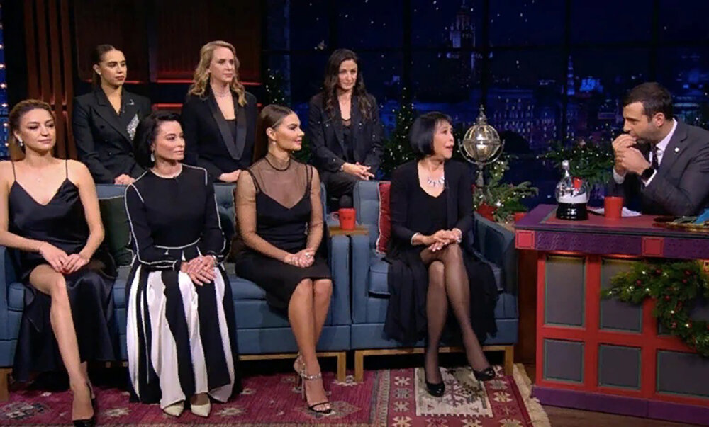 Юмористический вечер на нашем телевидении в компании телеведущего Ивана Урганта порадовал не так давно не только меня, но и всех поклонников российской гимнастики. Целая плеяда прославленных и менее известных спортсменок появилась в студии ток-шоу. Конечно, все дамы выглядели невероятно стильно, оделись в единой цветовой гамме и блистали вечерними украшениями. Особое внимание привлекла отечественная звезда, чемпионка и экс-депутат Алина Кабаева. И это неудивительно, ведь легенда гимнастики довольно редко появляется в объективе камер. Все взоры были прикованы к фигуре, наряду и драгоценностям очаровательной гости Ивана Урганта. И наша главная героиня, и ее коллеги (Маргарита Мамун, Екатерина Серебрянская, Лори Фанг, Евгения Канаева, Александра Тимошенко, Юлия Барсукова) предстали в стильных нарядах черной и черно-белой гаммы. Женственные жакеты и платья в бельевом стиле, черные туфли на шпильках и изысканные босоножки превратили отряд спортсменок в непобедимую армию стиля, элегантности