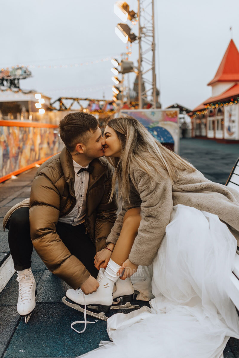 Мы решили отснять зимнюю ⛄ свадебно-романтичную фотосессию. В качестве локации выбрали один из самых красивых катков в Москве — ГУМ-каток на Красной площади. На данном катке нет жёстких ограничений по дресс-коду, можно кататься в свадебном платье и, что очень удобно, не надо доплачивать за профессиональную фотосъёмку. Подписывайтесь на наш инстаграм 📲 @story.dress, все самые свежие идеи для фотосессии сначала появляются именно там. Для образа невесты мы взяли в прокате Story Dress шубу из искусственного меха сложного бежево-лилового оттенка и свадебное платье-бандо с объемной юбкой из многослойного фатина. Для образа жениха приобрели в магазине пуховик коричневого цвета. Также при съемке мы задействовали игрушку для начинающих фигуристов в виде пингвина 🐧 Если вы хотите сфотографироваться без людей, то дождитесь окончания сеанса, когда начнут всех выгонять. И перед самым началом чистки льда у вас будет несколько минут, чтобы сделать фото без посторонних. - Серафима Романова @serafima