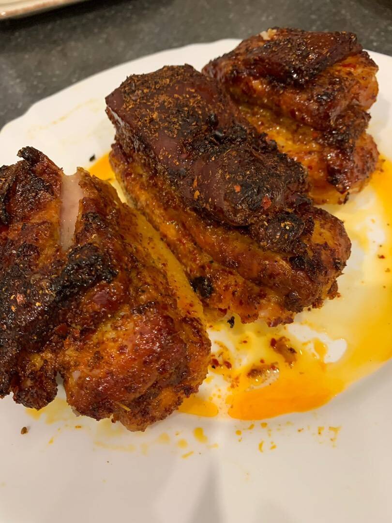 Готовимся к Новому году! Ингредиенты: мясо свиное, грудинка, Аджика Способ приготовления: Берём грудинку моем, просушиваем бумажным полотенцем, режем на куски по 300-350 гр,натираем аджикой со всех сторон, кладём в посуду и убираем в холодильник на сутки. Иногда переворачиваем. Из фольги делаем высокие лодочки, кладём в них промаринованное мясо и ставим в слегка разогретую духовку и постепенно увеличиваем до 170-180 градусов от 45-1 часа, в зависимости от толщины мяса. Готовность проверяем вилкой или чем то острым. Готовое мясо нарезаем пластинами, получается очень нежное и вкусное запечённое домашнее мясо. А также можно убрать в морозильник к праздничному столу. Всех с Наступающим Новым годом!!!