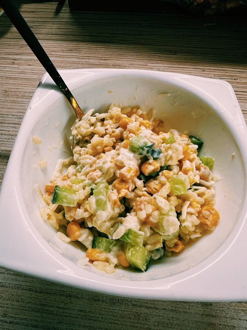 Ингредиенты: Яйца, Рис вареный, Сыр, Огурец, Кукуруза, Соль/перец