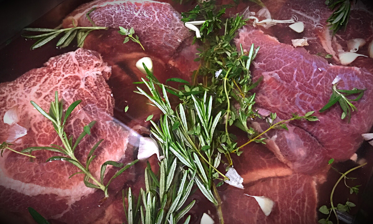 Достаем щечки из маринада и немного просушиваем. Пряные травы и чеснок не выбрасываем, они нам пригодятся.