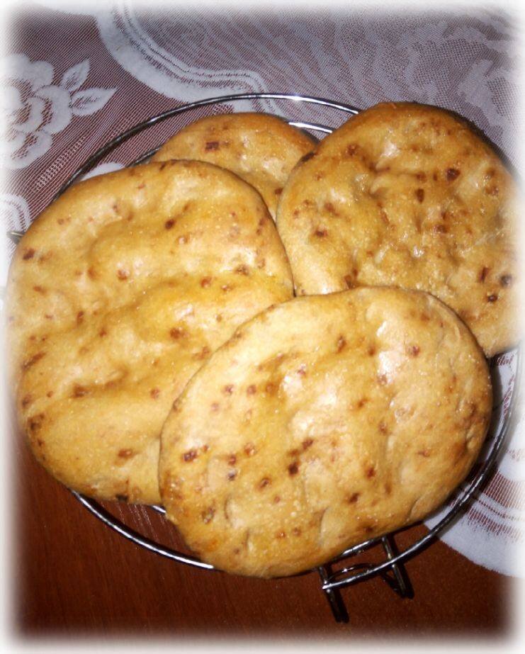 Ингредиенты: кефира, муки (пшеничная высшего сорта и пшеничная цельнозерновая в равных пропорциях), сахара , растительного масла, сухих дрожжей, соли, - сушёный лук Способ приготовления: Сушёный лук измельчить в блендере. В чаше смешать всю муку, дрожжи, сахар, соль, лук, всё перемешать. Добавить тёплый кефир, растительное масло, замесить тесто. Тесто должно быть эластичное и не липнуть к рукам, если потребуется, то добавить муки. Накрыть чашу с тестом пищевой плёнкой и оставить в тёплом месте,тесто должно подняться в два раза. Когда тесто будет готово, сформировать лепёшки, я разделила на 4 части, раскатала скалкой, положила на противень и оставила для расстойки, лепёшки должны подняться, смазала белком и выпекала при 180 градусов в духовке до готовности. Лепёшки получились вкусные, ароматные. Приятного аппетита!