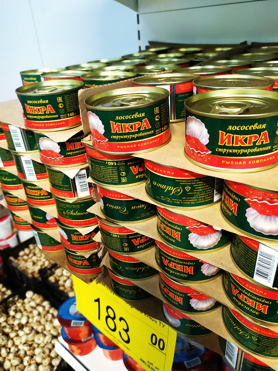 Вы наверное тоже замечаете, что в светофоре стала появляться имитированная красная икра разной масти, а сегодня я увидела даже чёрную "Царскую" в стеклянной банке. Всё это разнообразие стоит совсем недорого и я конечно уже сняла пробу. В этом обзоре хочу предложить вашему вниманию три варианта имитированной красной рыбы, которую я заметила в продаже "Светофора" города Крымск. В железной банке с ключом икра лососевая структурированная, массой 140 грамм. Цена 183 рубля. Как вы видите масса вся слипшаяся и заметно, что преобладает желе. На вкус икра малосольная и с трудом размазывается на хлебе с маслом. Икринки не лопаются, а просто мнутся на языке. В стеклянной банке икра "Царская" особая лососевая имитированная, массой 220 грамм. Цена 57 рублей. Скажу честно мне эта икра очень понравилась. Изготовлена на бульоне из горбуши, хороший состав и приятный рыбный вкус. На зубах аккуратно лопается. Для имитации совсем неплохо. На бутерброд мажется прекрасно, даже икринки сползают. Икра чёрная