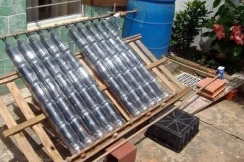 Это устройство абсолютно свободно обеспечит 80 литрами теплой воды семью из 4-х человек. И все что вам понадобится для этого: 50 пластиковых бутылок и 12 метров шланга. Пошаговая инструкция, как сделать солнечный водонагреватель из пластиковых бутылок Соберите по крайней мере 50 бутылок мягких одноразовых на 1-1,5 литра и снимите этикетку. 2. Купите в магазине 12 метров шланга для полива черного цвета (именно черного) 2 см в диаметре, 8 «Т-образных» переходников и два колена, рулон тефлона и два шаровых крана 2 см в диаметре. 3. В основании каждой бутылки проделываем отверстия, равные диаметру отверстия в горлышке. Можно дрелькой, а можно и раскаленной отверткой. Затем продеваем бутылки на шланг, так чтобы на один ряд приходилось по 6 бутылок. У вас должно получиться 5 рядов бутылок с длиной шланга по 2 метра. 4. Соединяем шланги Т-образными переходниками. 5. Выкладываем всю конструкцию в утепленную пенопластом коробку и соединяем патрубками с бочкой на 80 л. (Для лучшего теплового э