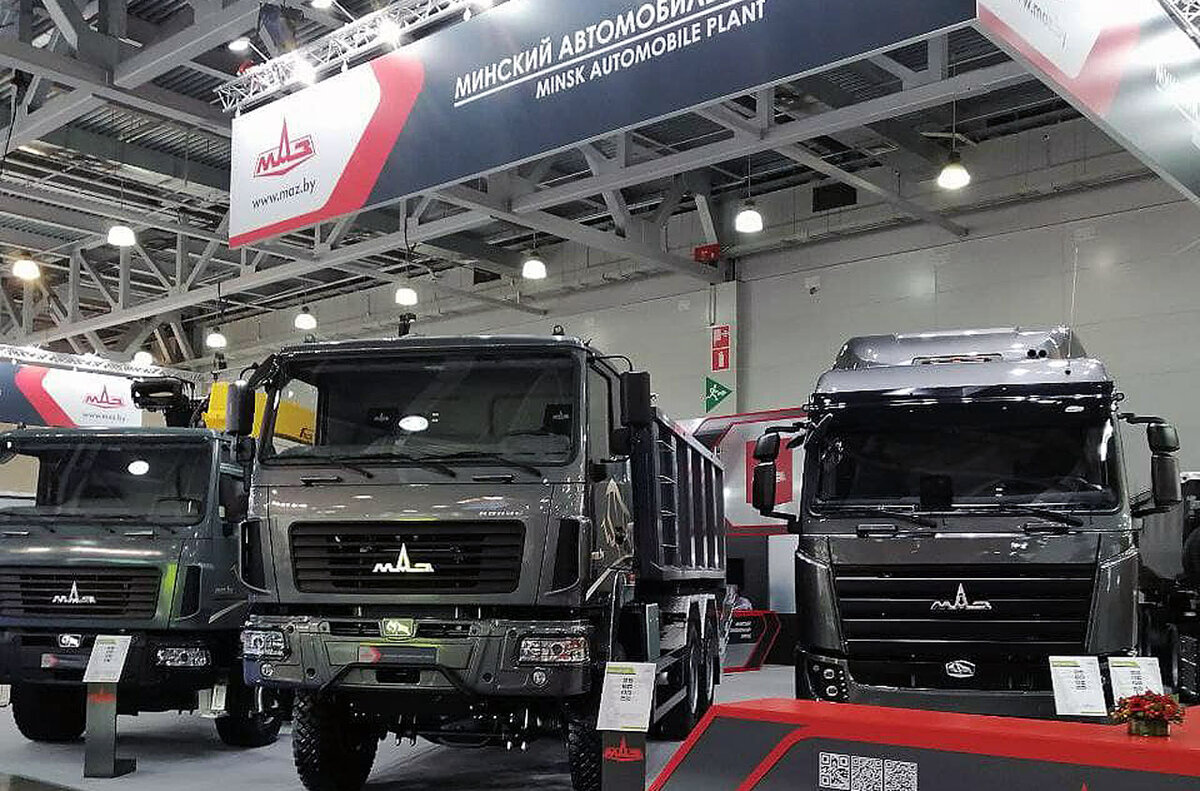 На международной выставке COMTRANS 2021 Минский автомобильный завод продемонстрировал грузовую, самосвальную, специальную и пассажирскую технику Восемьсот километров на метане Линейку магистральных тягачей представил МАЗ-54402N с колесной формулой 4х2. Особенностью грузовика, предназначенного для перевозки грузов в составе автопоезда, и работающего на сжатом метане, является наличие баллонов общим объемом 1092 л, расположенных не только в базе автомобиля, но и за кабиной, что обеспечивает запас хода до 800 км. Седельный тягач оборудован двигателем Weichai Power WP13NG430E2 экологического класса Евро-5 мощностью 419 л. с. и 16-ступенчатой коробкой передач. Допустимая общая масса автопоезда составляет 48 000 кг, технически допустимая общая масса автомобиля – 17 850 кг, полная масса в снаряженном состоянии – 9100 кг. На выставке тягач был представлен с самосвальным полуприцепом МАЗ-953001 грузоподъемностью 31,5 тонны, предназначенным для перевозки сыпучих грузов. Технически допустимая пол